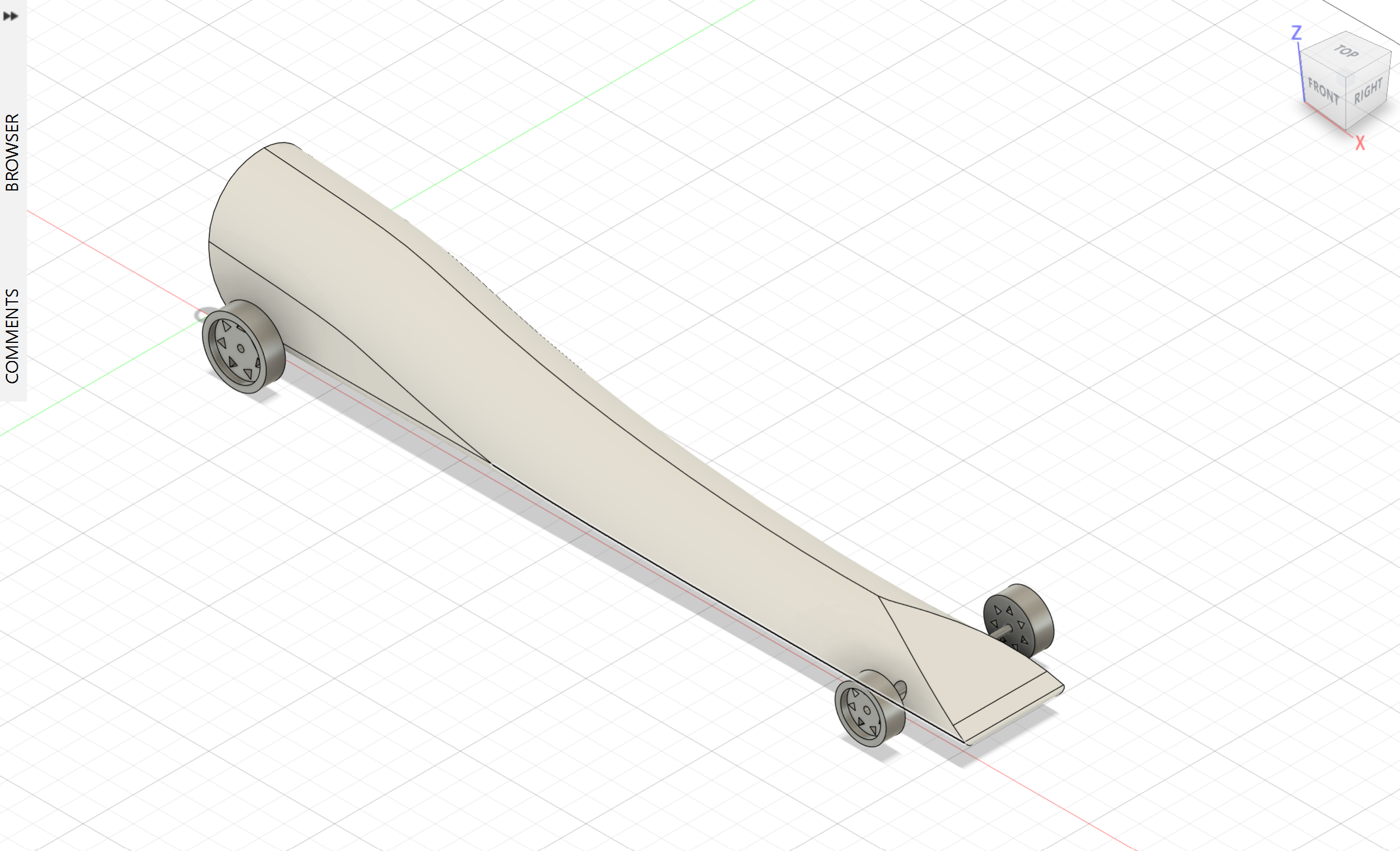 As the Aerodynamic Lead for a four-person team, I was responsible for the design and manufacturing of a competition dragster, focusing on minimizing aerodynamic drag while generating critical downforce to ensure track stability. I employed Autodesk Fusion 360 and CFD to rapidly iterate and analyze multiple body geometries, ultimately selecting a design that balanced conflicting requirements. The primary engineering challenge was optimizing the lift-to-drag ratio—specifically achieving sufficient negative lift (downforce) to prevent liftoff without significantly increasing overall mass or drag. The final design secured a 7th-place finish in the engineering design competition. Future iterations would focus on materials engineering to achieve a more lightweight chassis, further maximizing acceleration potential.